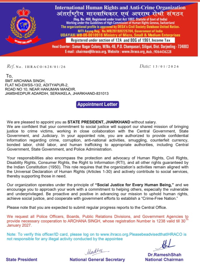 अंतर्राष्ट्रीय मानवाधिकार अपराध रोधी संगठन की एक महत्वपूर्ण बैठक सह अभिनंदन समारोह का आयोजन बिष्टुपुर एन रोड स्थित नृत्य कला केंद्र परिसर में किया गया। इस अवसर पर संगठन की झारखंड प्रदेश की नवनियुक्त अध्यक्ष अर्चना सिंह मुख्य अतिथि के रूप में उपस्थित रहीं। बैठक का संचालन पंचायत समिति सदस्य सुनील गुप्ता ने किए।