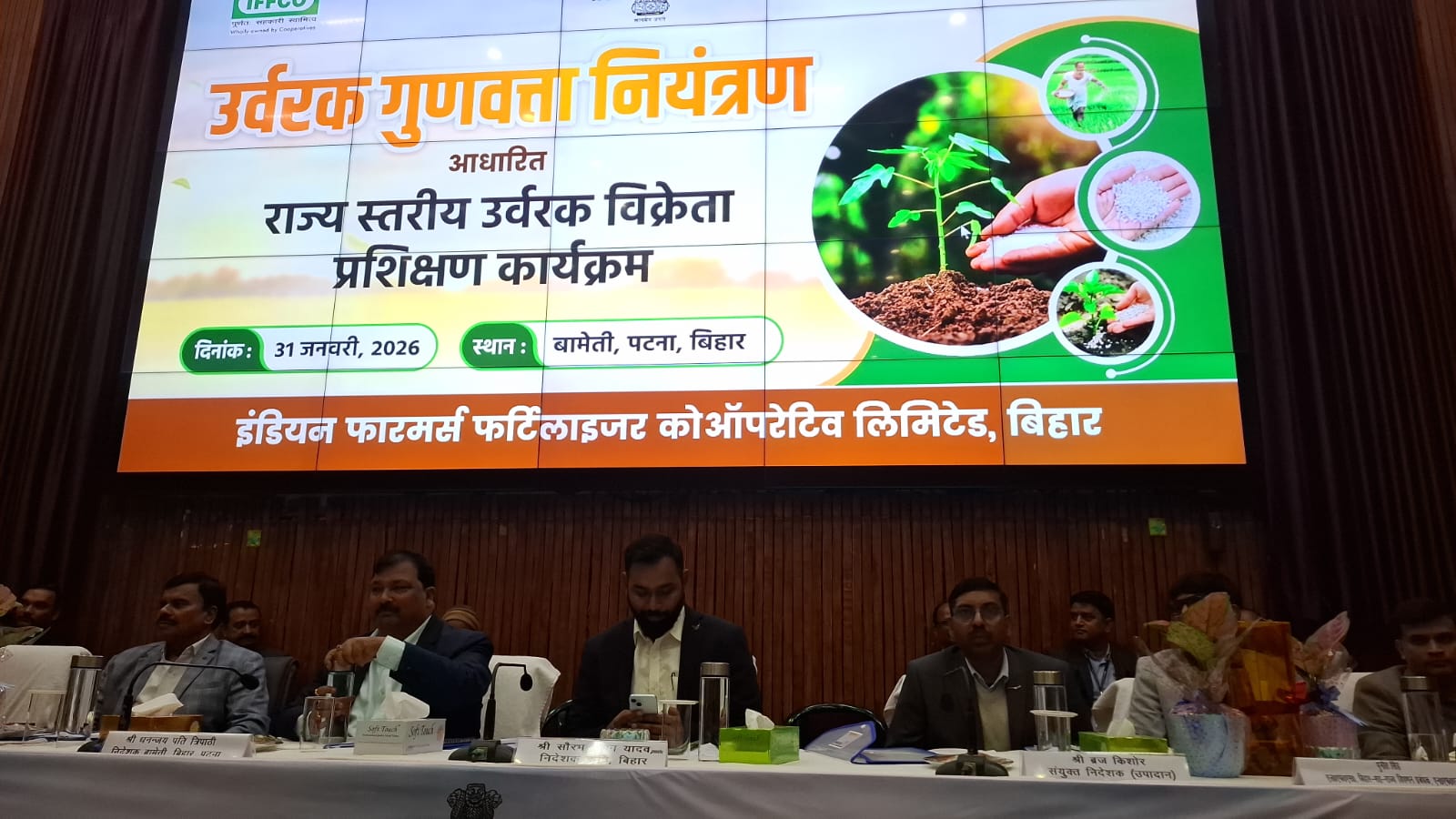 कृषि विभाग, बिहार के मार्गदर्शन में केन्द्रीय उर्वरक गुणवत्ता नियंत्रण एवं प्रशिक्षण संस्थान, फरीदाबाद (हरियाणा) तथा इफको के संयुक्त तत्वावधान में आज दिनांक 31 जनवरी 2026 को बिहार कृषि प्रबंधन एवं विस्तार प्रशिक्षण संस्थान (बामेती), पटना में बिहार राज्य के उर्वरक विक्रेताओं हेतु एक दिवसीय उर्वरक गुणवत्ता नियंत्रण आधारित प्रशिक्षण कार्यक्रम का आयोजन किया गया।
