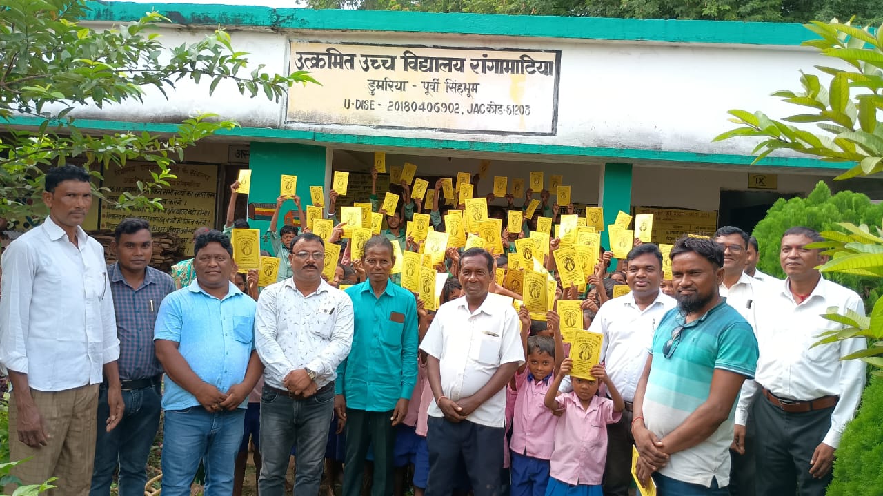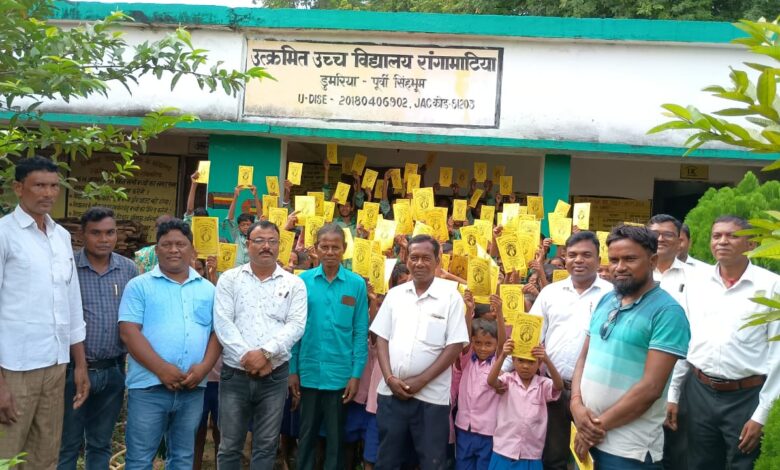डुमरिया क्षेत्र में संथाली बच्चों के बीच ओलचिकी किताबों का वितरण, खुशी से झूम उठे संथाली बच्चे।