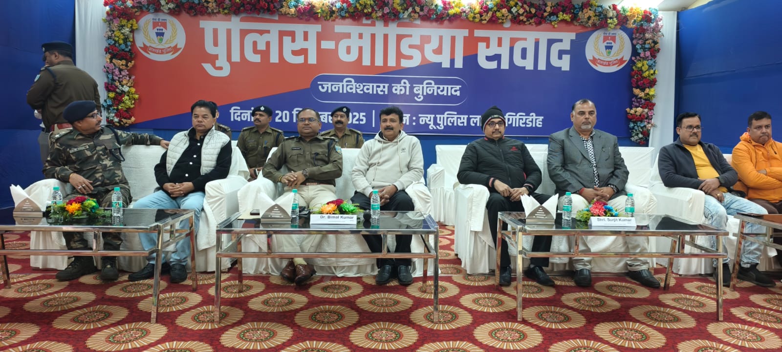 गिरिडीह : पुलिस द्वारा मीडिया संवाद के तहत ‘जनविश्वास की बुनियाद’ कार्यक्रम का आयोजन न्यू पुलिस लाइन, गिरिडीह में किया गया। कार्यक्रम की अध्यक्षता पुलिस अधीक्षक डॉ. बिमल कुमार ने की। इस अवसर पर जिले के प्रिंट, इलेक्ट्रॉनिक एवं डिजिटल मीडिया से जुड़े पत्रकार उपस्थित रहे।