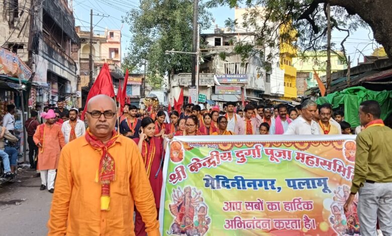 पलामू : माता रानी के जयकारे व भजनों से झुमते हुए माता रानी के भक्तों ने निकाली शोभायात्रा। मेदिनीनगर में श्री केंद्रीय दुर्गा पूजा महासमिति पलामू के तत्वावधान में आयोजित शोभायात्रा में काफी संख्या में श्रद्धालु शामिल हुए। स्थानीय जेलहाता जेल गेट के नजदीक नवयुवक संघ से निकाले गए शोभायात्रा में संघ के सदस्यों के द्वारा श्री केंद्रीय दुर्गा पूजा महासमिति पलामू के के केन्द्रीय अध्यक्ष दुर्गा प्रसाद जौहरी के नेतृत्व में सभी पदाधिकारीयों व सदस्यों का पगड़ी पोशी व माता रानी के चुनरी से स्वागत किया गया।
