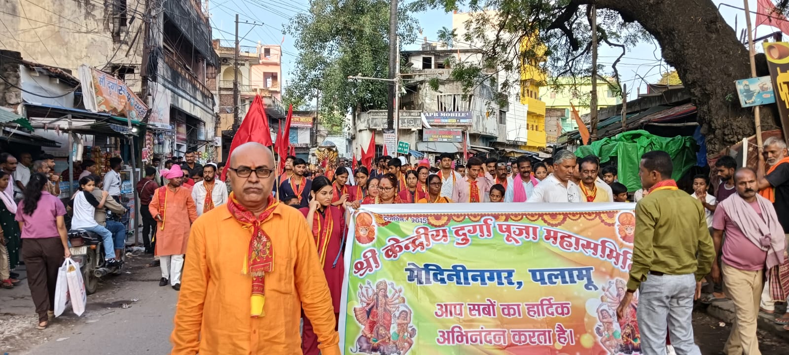 माता रानी के जयकारे व भजनों से झुमते हुए माता रानी के भक्तों ने निकाली शोभायात्रा। मेदिनीनगर में श्री केंद्रीय दुर्गा पूजा महासमिति पलामू के तत्वावधान में आयोजित शोभायात्रा में काफी संख्या में श्रद्धालु शामिल हुए।