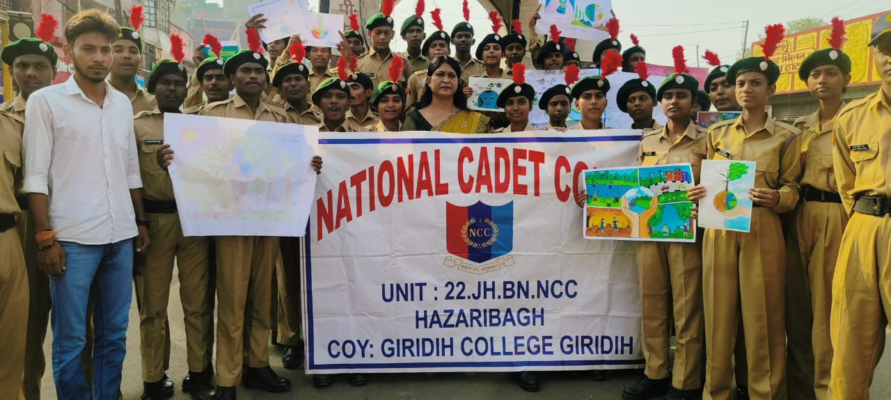 गिरिडीह के झंडा मैदान से टावर चौक तक हाथों में पर्यावरण जागरूकता का पोस्टर लेकर और नारों के साथ लोगों को पर्यावरण के संरक्षण और संवर्धन को लेकर जागरूक किया गया। उसके बाद प्रो विनीता एवं सभी कैडेट्स के द्वारा गिरिडीह कालेज में पौधारोपण किया गया।