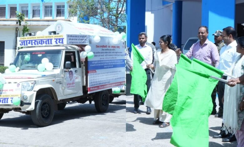 मेदिनीनगर (पलामू) : केंद्र प्रायोजित पेंशन योजनाओं के सामाजिक अंकेक्षण के व्यापक प्रचार-प्रसार हेतु शनिवार को उपायुक्त सह जिला दंडाधिकारी समीरा एस द्वारा समाहरणालय परिसर से जागरूकता रथ को हरी झंडी दिखाकर रवाना किया गया।यह जागरूकता रथ जिले के विभिन्न प्रखंडों,पंचायतों एवं गांवों में भ्रमण कर लोगों को राष्ट्रीय सामाजिक सहायता कार्यक्रम (NSAP) अंतर्गत संचालित पेंशन योजनाओं—इंदिरा गांधी वृद्धावस्था पेंशन योजना,