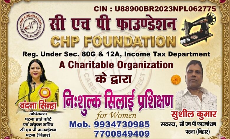 पटना : समाज में महिलाओं को आत्मनिर्भर और सशक्त बनाने के उद्देश्य से ‘सी एच पी फाउंडेशन’ (CHP Foundation – एक मान्यता प्राप्त चैरिटेबल संस्था) द्वारा महिलाओं के लिए तीन महीने के निःशुल्क सिलाई प्रशिक्षण कार्यक्रम का शानदार आगाज किया गया।