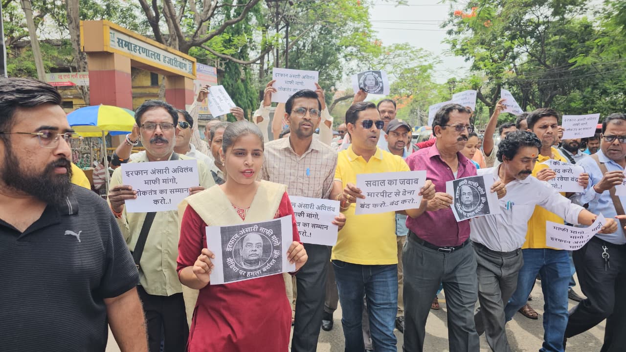 हजारीबाग : बीते 28 अप्रैल को हजारीबाग के दो पत्रकारों पर हुए हमले के विरोध में गुरुवार को जिले के हजारीबाग प्रेस क्लब ने शहर के डिस्टिक मोड़ चौक पर जोरदार प्रदर्शन किया। करीब एक से दो घंटे तक चले इस विरोध-प्रदर्शन में बड़ी संख्या में पत्रकार शामिल हुए, जिनमें घटना को लेकर गहरा आक्रोश साफ तौर पर नजर आया। प्रदर्शन के दौरान पत्रकारों ने हमलावर युवक की शीघ्र गिरफ्तारी और झारखंड सरकार के स्वास्थ्य मंत्री इरफान अंसारी से सार्वजनिक माफी की मांग को लेकर जमकर नारेबाजी की।